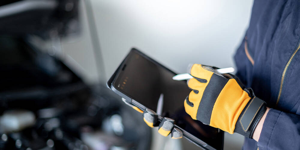 専用ツールで車両と接続し、カメラの調整作業を行います。